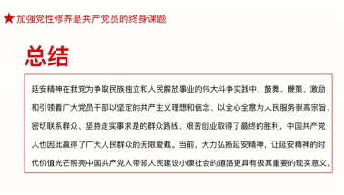 而后就延安精神的四个重要内涵:自力更生、艰苦奋斗的创业精神,全心全意为人民服务的精神,坚持正确的政治方向,解放思想、实事求是的思想路线,并播放了视频进行了有趣的复习,进一步分别拓展了每一种延安精神内涵在当代的精神启示。
